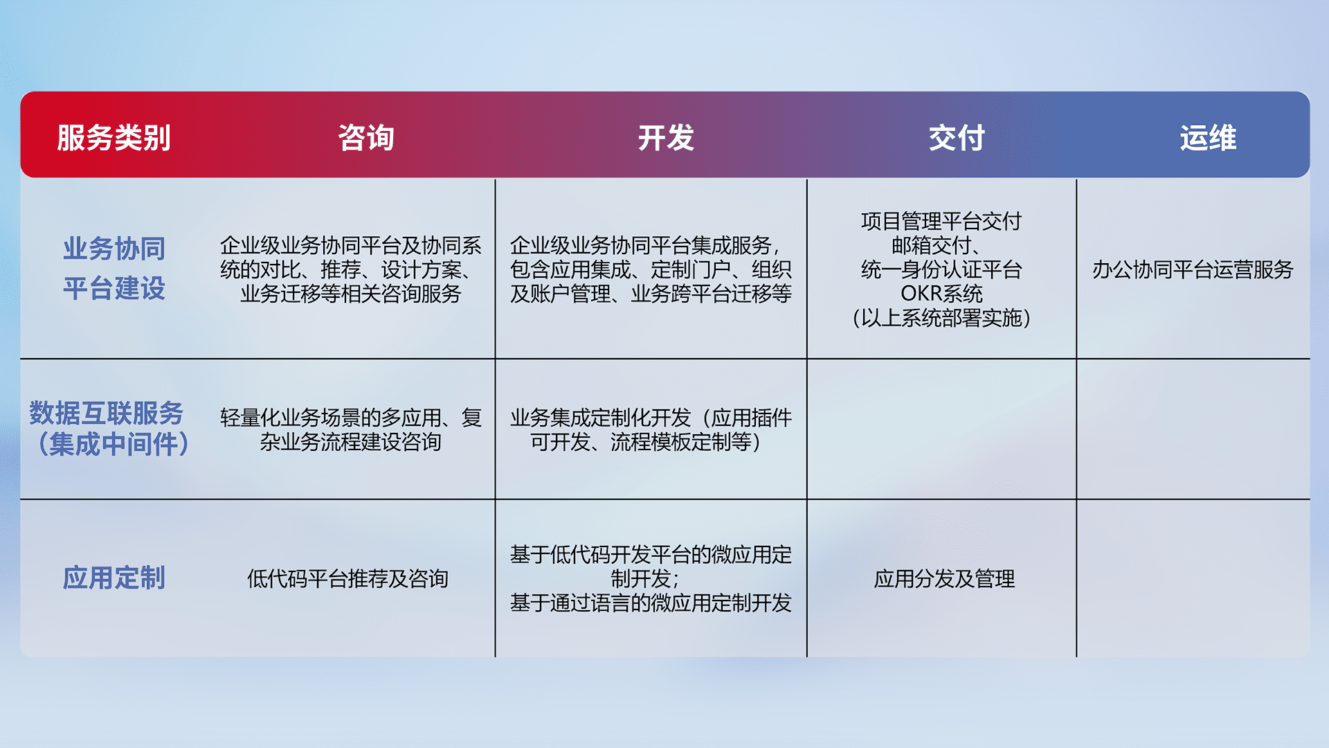 针对钉钉、、企微、、、IDaas等平台级产品提供产品的规划、、方案、、、交付、、、定制化开发等服务,,实现如统一协同办公、、智能客户服务、、、混合会议管理、、、、智能数据查询、、、、等业务场景,,,,实现数字化转型。。。